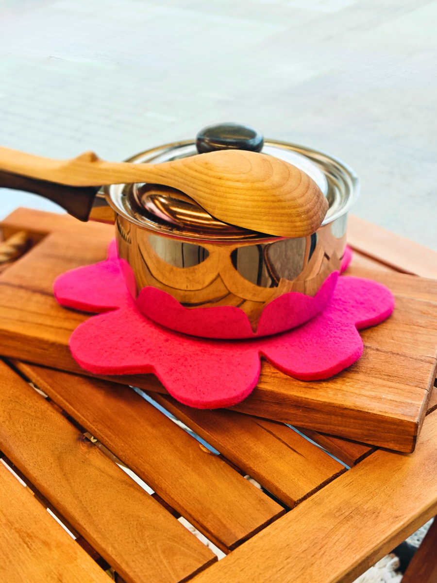 Apilan muotoinen pannunalunen tuo kattaukseen pehmeää ilmettä ja suojaa pöytäpintoja tehokkaasti. Se on käytännöllinen ja kaunis yksityiskohta, joka toimii niin arjessa kuin kattauksissakin.